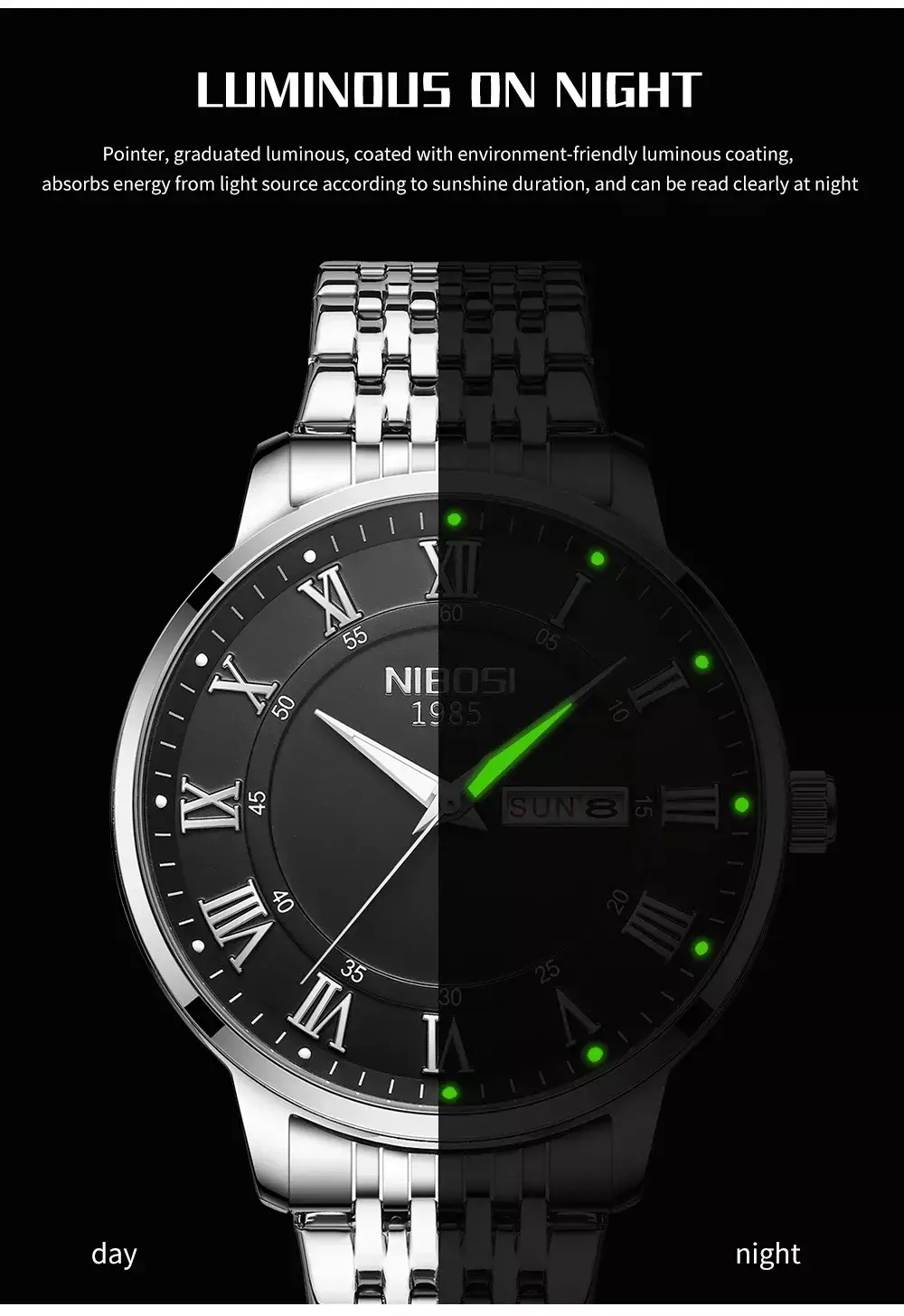 A pulseira em aço inoxidável com fecho oculto proporciona encaixe perfeito e conforto absoluto, ideal para longas horas de uso. Resistente a choques e impactos, o Nibosi mantém o mesmo visual elegante mesmo com o passar do tempo.